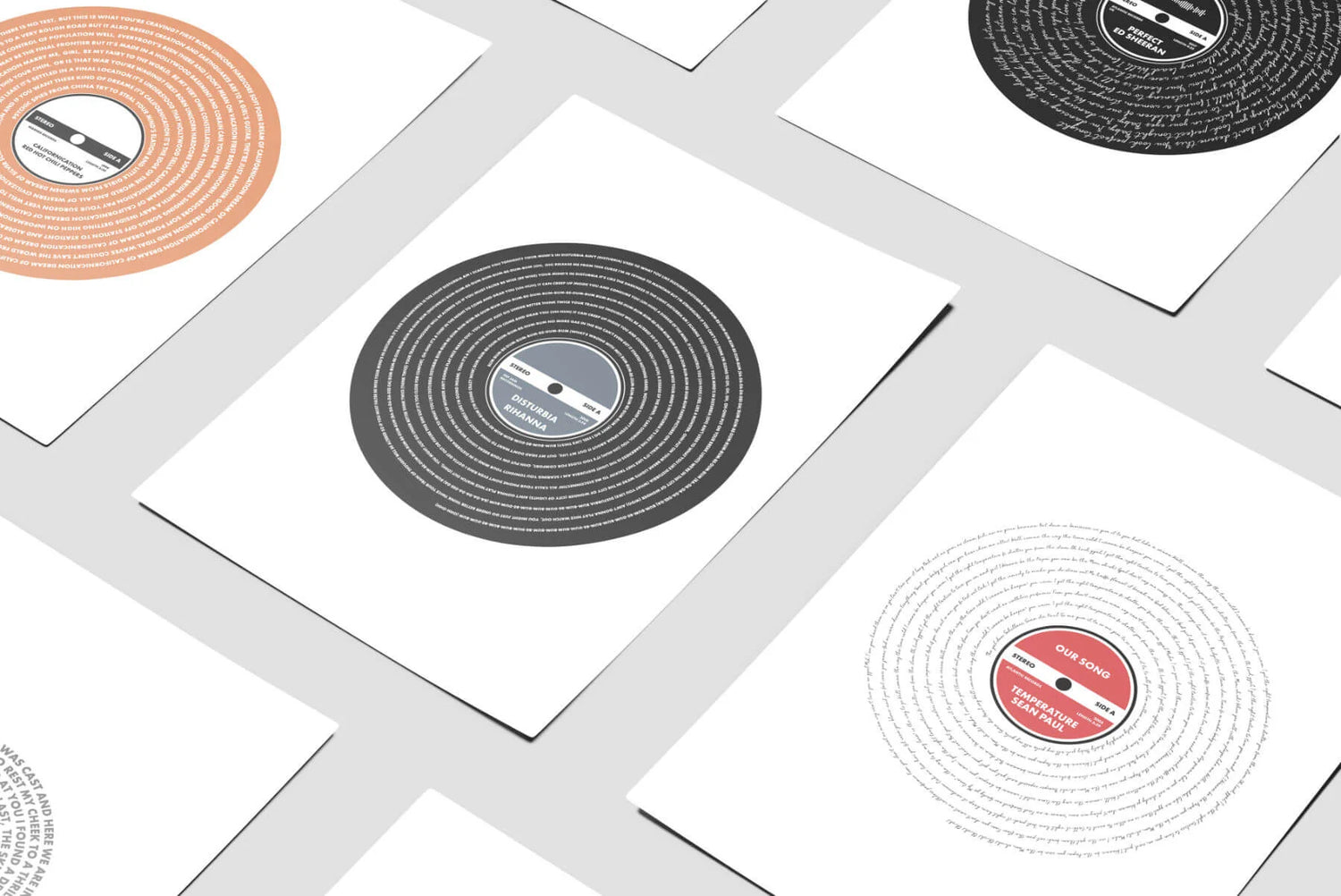 We create vinyl artwork displaying the song information at the centre and the song lyrics spiralling around the outside to form a beautiful piece of artwork.
