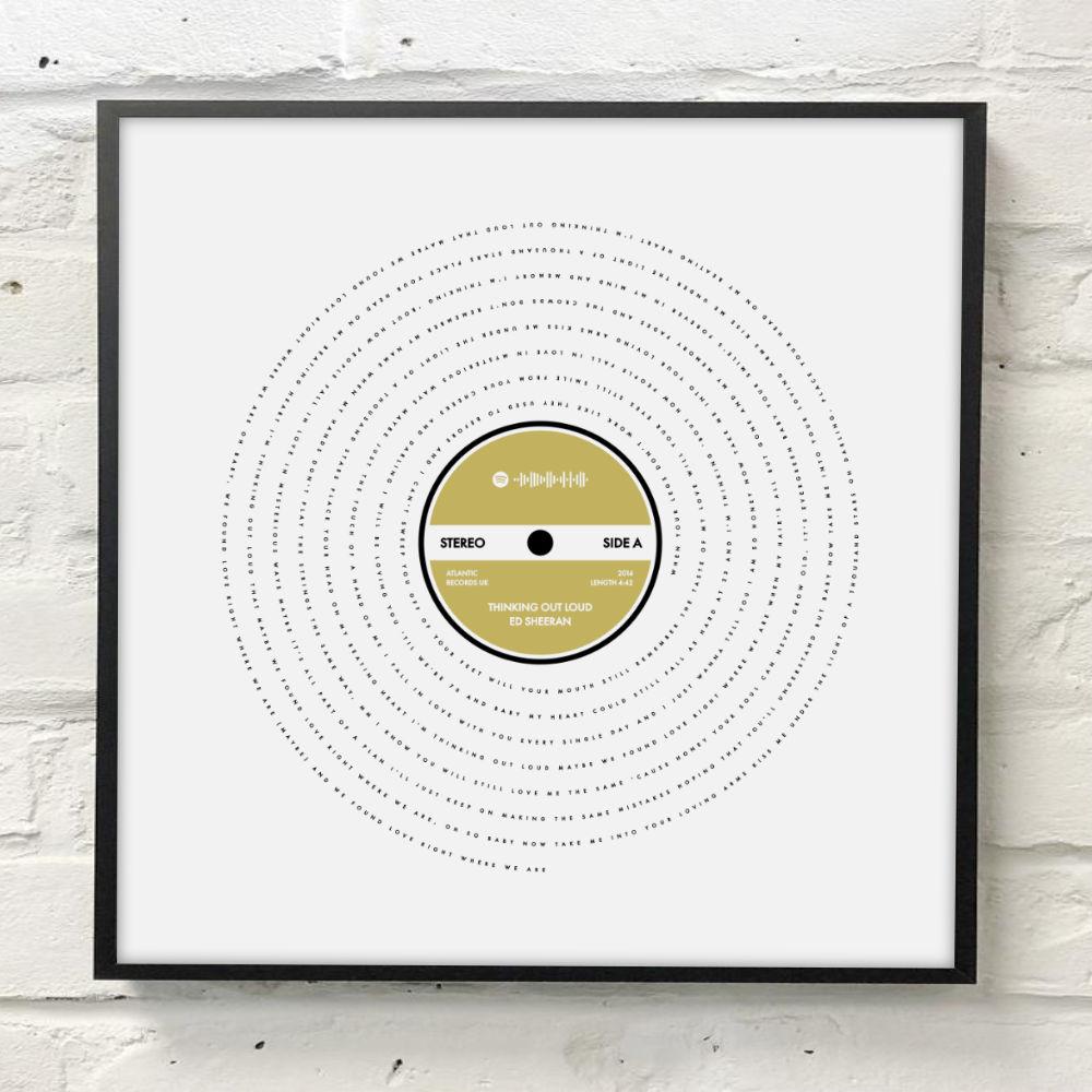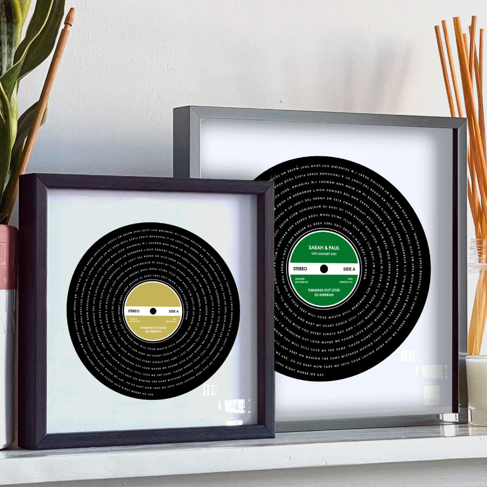 Display your favorite song lyrics in the shape of a vinyl record with our stylish lyrics print. So easy to use! Simply search for your song and our software automatically captures all the information and generates a live preview straight away. Then add the lyrics in the 'Edit Text' option. You may also personalise the design with extra text at the top center such as adding names and a date to make this into a Wedding Anniversary gift, couple gift, Birthday gift or New Home, Valentine's Day.
