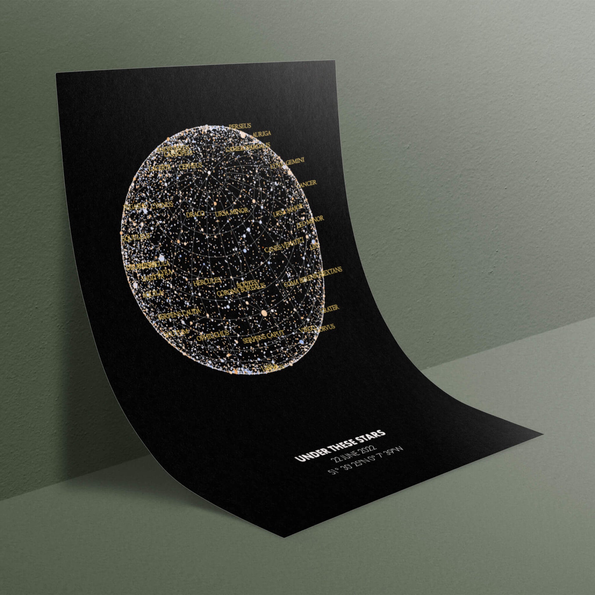 Display how the stars appeared on any date (and time) and at any location in the world. Our star maps uniquely show between 6,000 and 8,000 stars, the planets, the Moon and the Sun depending on your chosen date, time (optional) and location. Each map beautifully shows the outline of the constellations and the name of the planets in high definition - we are the only company providing this level of detail.